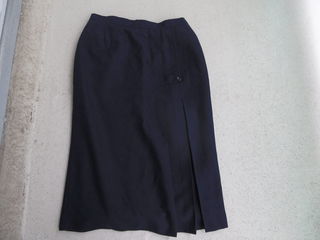 bleu marine doublée longueur 80 cm 2 plis sur le coté fermeture éclair et bouton dans le dos 50 % polyester 50 % viscose lavage à 40° bon état Visible Le Ter