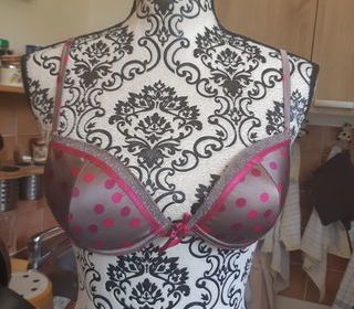 VEND soutien gorge Satiné taupe a pois fushia, ETAM taille 90C bonnets pré formés, effet satinés bretelles satinées a motifs pois fushia , réglables noeud satiné fushia au mil