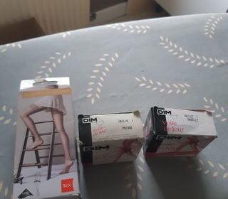 VEND 2 collants DIM voile de jour, ET bas TEX NEUF TAILLE 1 1 collant voile de jour DIM taille 1 couleur poivre 15D 100% polyamide, prix 1.50 euros 1 collant voile de jour DIM t