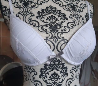 VEND soutien gorge blanc taupe motifs brodés ETAM TAILLE 90B BONNETS préformés et renforcés motifs broderies couleur taupe petit noeud satin taupe au milieu des bonnets galon f