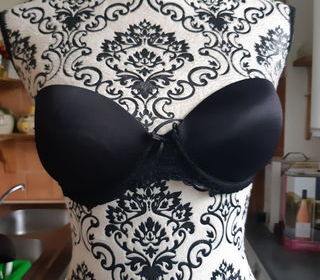 VEND soutien gorge ,noir bustier, ETAM, taille 85C bonnets préformés , renforçés a armatures jolie dentelles petit noeud au milieu des bonnets bande un peu adherante pour un me