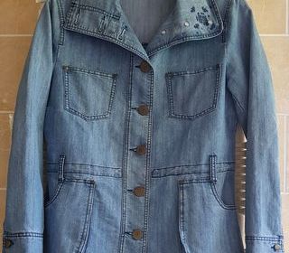 Veste en jean taille 42 Peut se porter col ouvert ou fermé Possibilité resserrage à la taille par liens intérieurs Largeur d'épaules : 42cm Hauteur milieu dos : 75cm En parfai