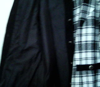 C'est une veste à grands carreaux noir et blanc de demi-saison en polyester, laine et autres produits. Elle n'a été porté qu'une fois, elle a un col à revers noir continuant sur l