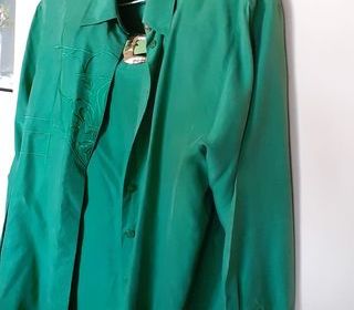 Très jolis ensemble de couleur verte, marque "UN JOURS AILLEURS" composé d'un e jupe doublée, fermeture éclair dans le dos, ceinture bijoux et d'un chemisier, col tailleur, broder