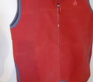 Trés belle veste courte femme en polaire épais sans manche, deux poches. Bord des poches, des manches et bas du vêtement gancés en gris. Fermeture éclair, col montant. Marque KK de