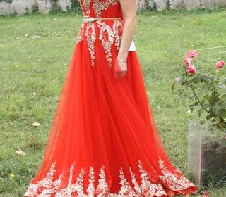 robe de soirée longue attache au bustier et fermeture pour la robe une ceinture a la taille et des stras partout couleur rouge