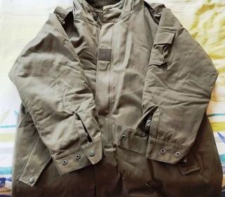 Parka originale armée avec doublure amovible à capuche, couleur = vert olive, en très bon état. Taille 104 C