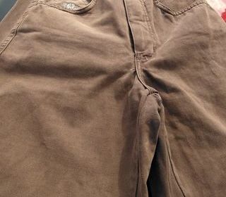 Vends pantalon pour femme marron en peau de pèche à 4 poches, en très bon état