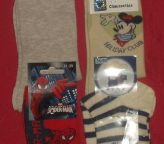Lot de 4 paires de chaussettes NEUVES. -Chaussettes Spiderman NEUVES. Taille 31-35. -Chaussettes Mickey NEUVES. Taille 35-41. -Chaussettes Chipie NEUVES. Taille 36-40. -C