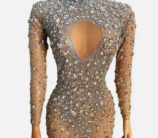 Robe de Soirée Star T 38 / 40 couleu nude avec cristaux effets miroirs Neuve