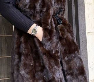 Manteau en fourrure noire, très douce et épaisse, offrant un excellent confort thermique. La coupe est droite et élégante, avec un col large et structuré qui apporte une touche sop