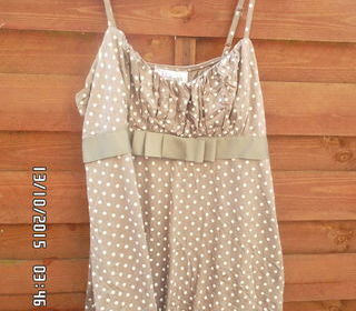 A SAISIR HAUT GRIS A POIX BLANCS-MARQUE ARMAND THIERRY-AFFINITES-50 % VISCOSE-50 % POLYAMIDE-A NOTER MINI IMPERFECTION AU NIVEAU DE L AISSELLE DROITE-MESURES--34 CMS AUX EPAULES-50