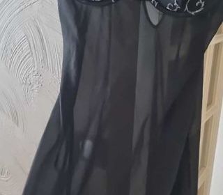 Vends très belle nuisette noire et argent .T42. Valeur magasin 75 euros . Beaucoup de détail jusqu'au nÅ"uds argenté en bas. String assorti taille L. L'ensemble est en très bon ét