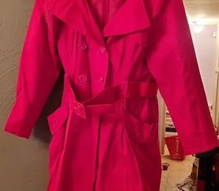 Vends trench rouge neuf. Donc en très bon état. Couleur rouge pétillant. Ceinture . Forme capeline sur le dessus.