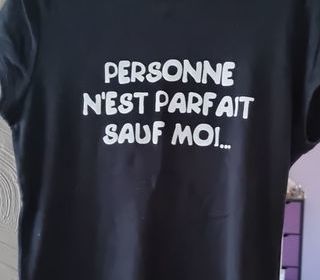 Vends tee shirt noir. Personne n'est parfait sauf moi. Neuf. Taille 4.