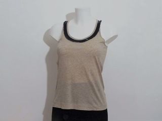 Top/ Tee Shirt Beige à Encolure Noir en Tissu et Perles- Taille S- Escorpion * Top/ tee shirt beige sans manches à encolure arrondie où est cousu tout autour un tissu semi trans