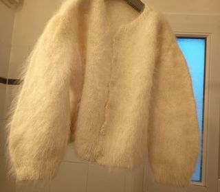 Hello, je vends un gilet enfant, taille 5/6 ans, plutôt fille, angora blanc, neuf sans étiquette. Boutonné devant. Malheureusement, la photo ne rend rien. La couleur est jaune, alo