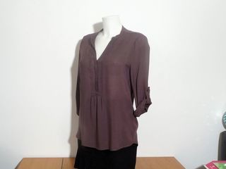 Robe en tissu fin ( voile ) Couleur: imprimé géométrique noir et bleu-violet Manches longues boutonnées raglan Col et revers 3 boutons nacrés Taille 46/48
