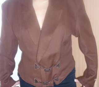 Spencer marron, T. 40/42, tissu lainage doublé, bonne qualité, fermeture devant par 2 attaches, demi-saison.