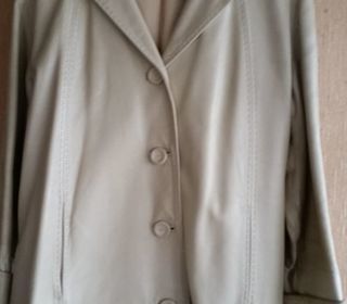 Veste femme en cuir Couleur crème Fermée par 4 boutons recouverts cuir assorti Col tailleur Manches raglan avec petits revers Poches verticales dans la couture de l'empiè