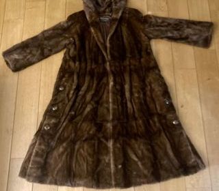 Grand et long manteau marron en vison avec capuche Marque Rébecca Vente à 600 € Largeur du bas : 1m20 Longueur : 1m25 sans la capuche Longueur des manches : 63 cm Largeur poi