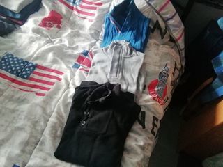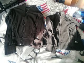 Vends lot de 4 articles de sport taille M 1 sweat à capuche bleu marine jack and Jones, 1 sweat à capuche bleue blanche noire, 2 vestes noires domyos Indispensables pour tout