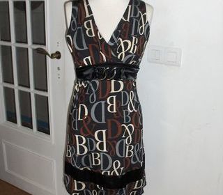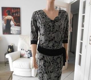 Tres jolie petite robe en matière polyester/elasthanne , fond noir , imprimé lettres gris/ecru/marron . vite lavee, vite seche aucun repassage . Morgan exposee en photo sur