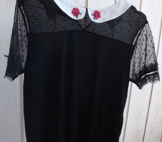 Top noir, col blanc brodé de roses ,manches courtes en dentelle , marque Naf Naf , taille 38 , 100 % viscose