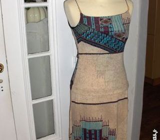 SUPERBE ! ROBE marque RECTANGLE BLANC . Doublée . Fines bretelles agrémentées de perles bois . Base asymétrique , fendue au coté . Coloris en mélange beige/turquoise/violet . Expos