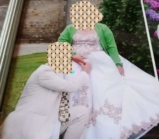 Vends robe de mariée taille 50 portée 2 jours avec jupon en cerceaux couleur blanche dentelle marron clair très belle tenue manche courte nettoyage pressing avant la vente très