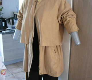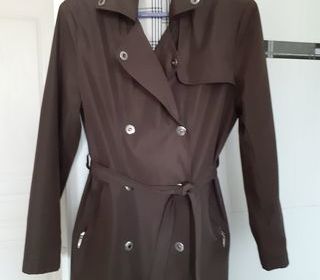 Trench court taille 42, polyester, colorie marron glacé, matière soyeuse, doublure prince de Galle.