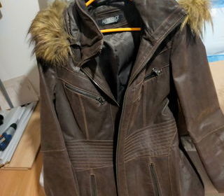 Manteau femme cuire capuche avec fourrure très bonne état, taille M couleur marron, pas de payement par virement,a retirer sur place