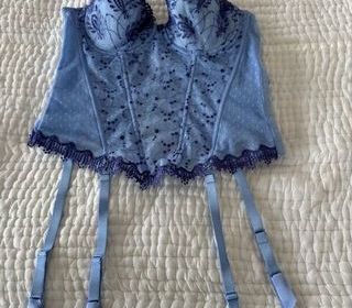 Guêpière Chantelle bleue dentelle et broderie porte jarretelles satin 95 B fermeture par lacet ou agrafes