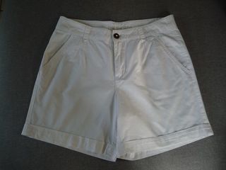 Short blanc, 2 poches devant, fermé par glissière + bouton, 1 fausse poche au dos, petit revers au bas des jambes. 100 % coton. Longueur jambes depuis la taille : environ 38 cm. Ta