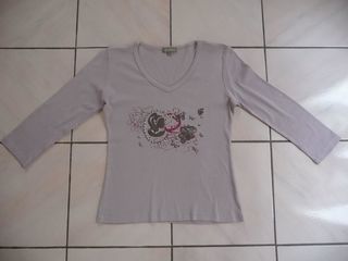 Tee-shirt gris clair, col V, manches 3/4, joli motif baroque, 100 % coton, lavable 40°. Longueur : 56 cm, longueur manches : 45 cm. Taille M. Prix : 6.00 € + frais d'envoi par M