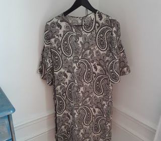 Jupe imprimée fleurs blanc, rose, gris sur fond noir "WILD PONY" taille XS Longueur : 85cm Ferme par zip côté gauche Fendue devant gauche 100% polyester