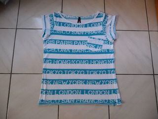 Tee-shirt rayures turquoise/blanc, motifs noms de villes célèbres London, San Francisco, New York, ... petite poche poitrine, manches courtes. Matière synthétique. Longueur : 63 cm