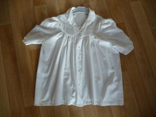 Chemisier blanc, style blouse, manches courtes, petit col, empiècement arrondi devant et dos, entièrement boutonné devant. Coton très doux, agréable à porter. Longueur : environ 61