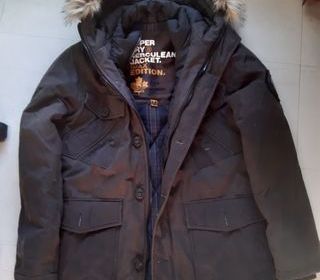 Vend manteau rembourré Super Dry Mountain état neuf couleur marron foncé Taille M Impossible à modifier, à récupérer sur place