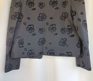 Veste courte de créateur Mod Ecran x Armadiane , fabrication française, pièce neuve jamais portée. Tissu gris brodé de motifs floraux noirs, coupe élégante et moderne pour un look