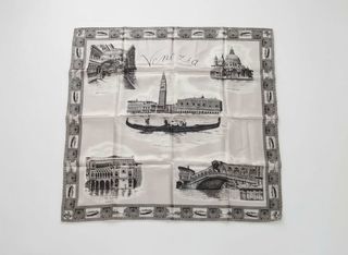 Magnifique foulard carré en véritable soie, motif Venise, époque vintage (circa années 70-80). Illustration détaillée des monuments célèbres de Venise : Palais des Doges, Basilique