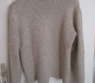 Pull de couleur beige, tricoté maison en laine. Correspond à une taille L. Col rond, roulé. Bon état, laine un peu peluchée. Longueur au dos 57 cm, largeur sous les bras 51 cm, l