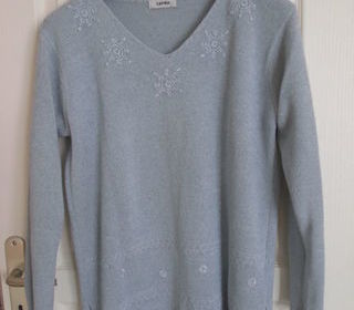 Pull bleu ciel, col V, long, avec motifs brodés au niveau du col et en bas du pull. Noté taille 42/44. Marque Zafira. 40% acrylique, 40% viscose, 20% polyamide. Bon état mais mat