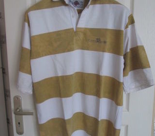 Polo rugby homme, manches courtes, marque Cotton Oxford. 100% coton. Noté taille L, taille grand plutôt XL. Rayures blanches et beiges tachetées. Bon état. Longueur au dos 76 cm