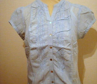 Chemisier manches courtes ballon . Bleu et blanc petites rayures. 4 rangées de fronces de chaque côté sur le devant.