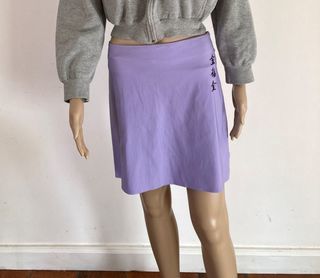 Jupe années 90, courte, moulante avec fente sur la cuisse. C'était la mode des idéogrammes sur les fringues. Le tissu synthétique est typique de cette période. Parfaite en été ave