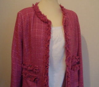 Veste lainage "style Chanel" à porter sur une robe ou sur un jean pour un look plus actuel. * Effet de franges encolure, devants et poches. * Boutons dorés aux poches * Par
