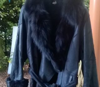 Veste cuir noire fourree interieur mouton toscane Col en renard Ferme avec la ceinture et une pression Prix interessant