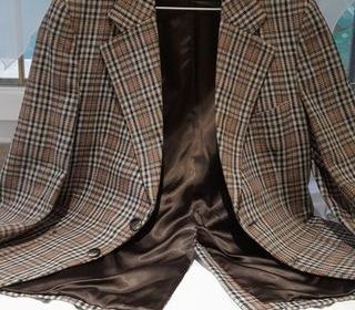 Veste blazer à carreaux. Largeur épaules à épaules 43 cm, longueur veste 73 cm, longueur manches 55 cm , deux boutons, patte ouverte dans le dos bas de blazer 26 cm. Tour largeur