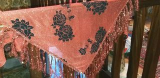 J'ai acheté ce joli petit châle chatoyant à Louxor le 24/12/1988 ! Je ne l'ai porté qu'à deux reprises. Fleurs noires veloutées sur fond rouge polyester irisé de fils dorés, avec